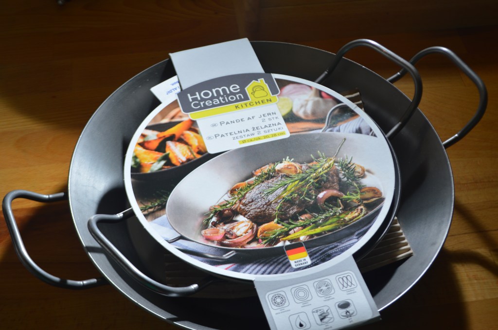 A fent említett áruházban bukkantam a Home Creation márkájú vasserpenyő szettre. Egy 20, és egy 28 cm átmérőjű serpenyőt tartalmazott a csomag. A kisebb 740 grammos, a nagyobb közel 1,4 kg-ot nyom. Nagyjából 1,5-2 mm közötti vaslemezből préselhették. A kettő együt kb. 4500 ft-ba került.